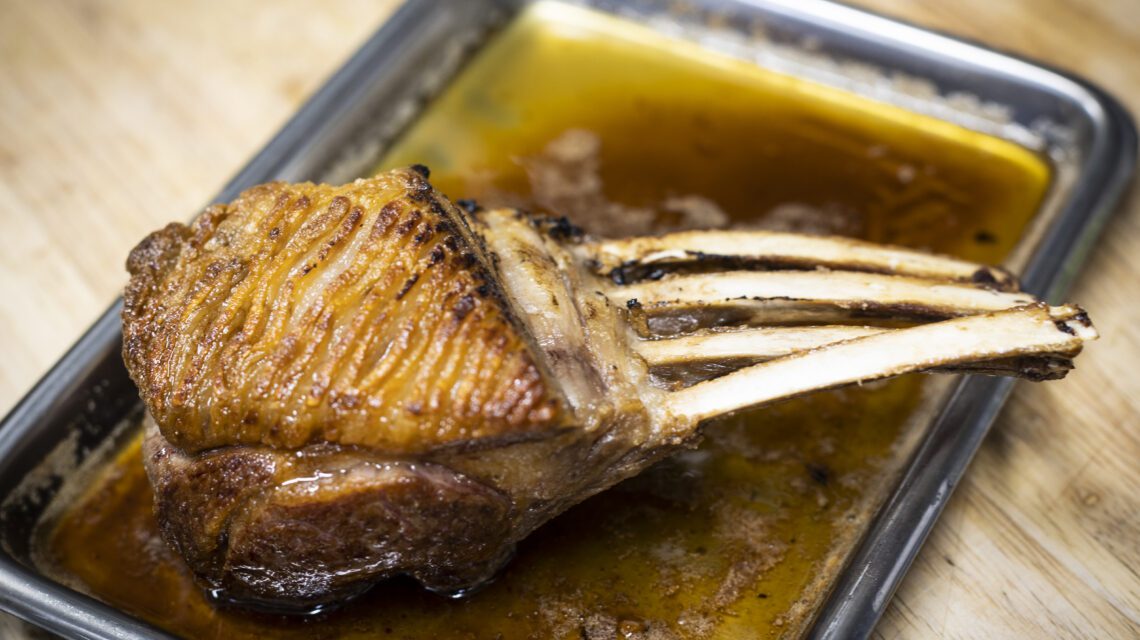 Brun kjøttet i panna med fettsiden ned før det stekes i ovnen til det får en kjernetemperatur på 55-60 grader.